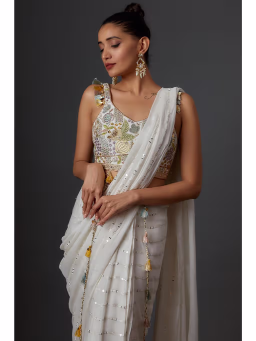 Off White Embroidered Saree With Stiched Blouse